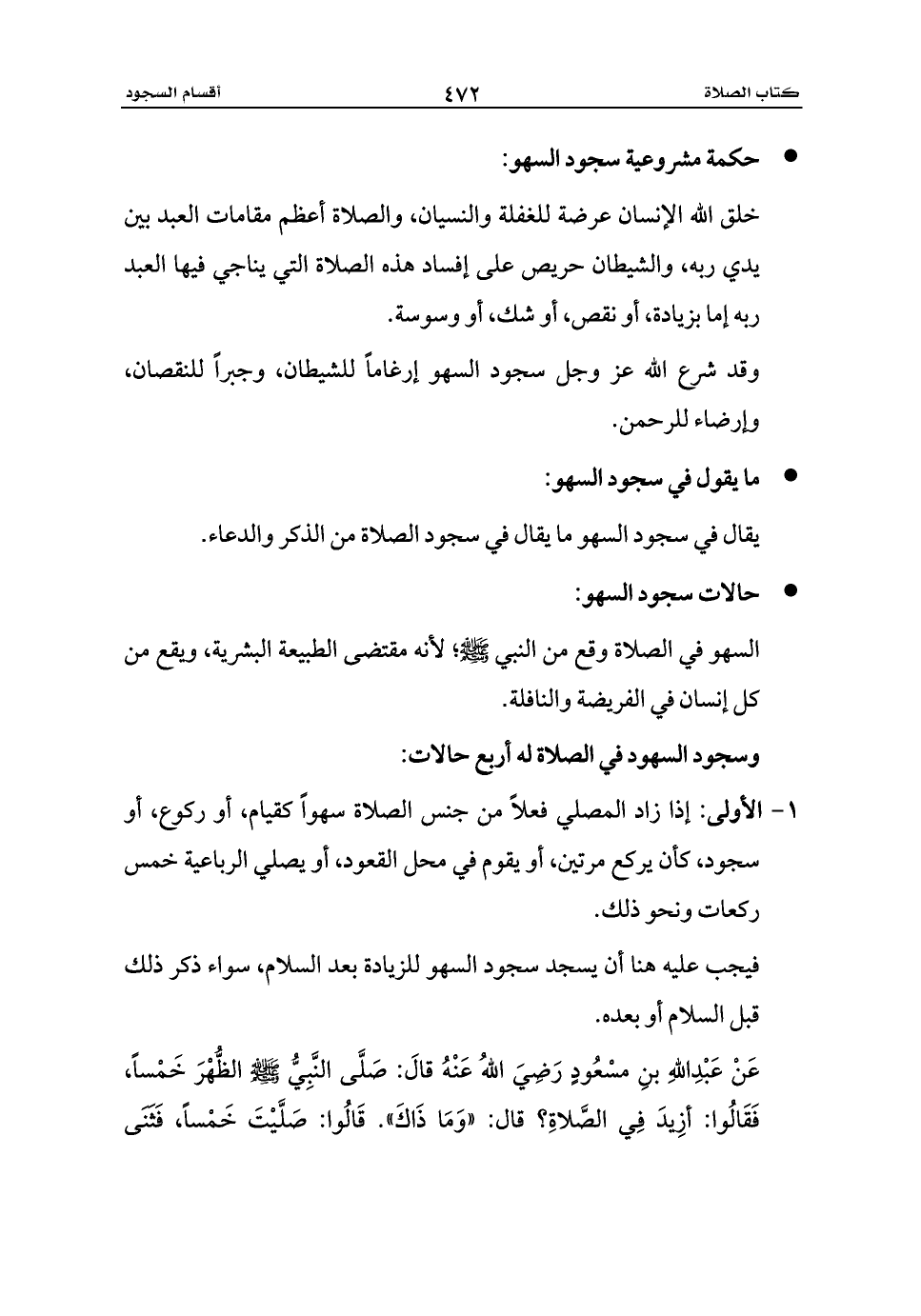 عَنْ عَبْدِاللهِ بنِ مسْعُودٍ رَضِيَ اللهُ عَنْهُ قالَ: صَلَّى النَّبِيُّ - صلى الله عليه وسلم - الظُّهْرَ خَمْساً، فَقَالُوا: أزِيدَ فِي الصَّلاةِ؟ قال: «وَمَا ذَاكَ». قَالُوا: صَلَّيْتَ خَمْساً، فَثَنَى