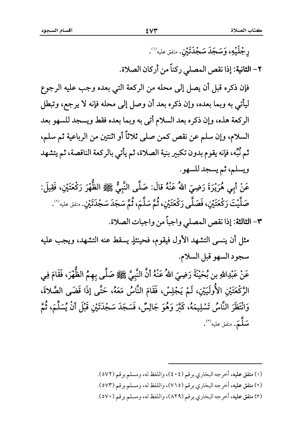 عَنْ أبِي هُرَيْرَةَ رَضِيَ اللهُ عَنْهُ قالَ: صَلَّى النَّبِيُّ - صلى الله عليه وسلم - الظُّهْرَ رَكْعَتَيْنِ، فَقِيلَ: صَلَّيْتَ رَكْعَتَيْنِ، فَصَلَّى رَكْعَتَيْنِ، ثُمَّ سَلَّمَ، ثُمَّ سَجَدَ سَجْدَتَيْنِ. متفق عليه (¬2).