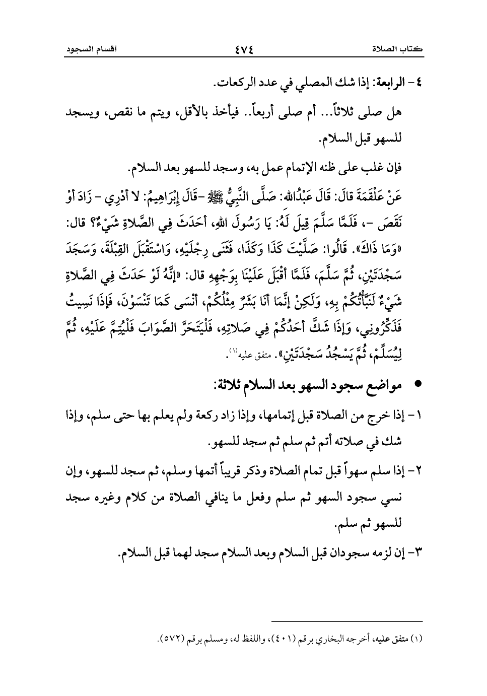 عَنْ عَلْقَمَةَ قالَ: قَالَ عَبْدُاللهِ: صَلَّى النَّبِيُّ - صلى الله عليه وسلم - قَالَ إِبْرَاهِيمُ: لا أدْرِي - زَادَ أوْ نَقَصَ -، فَلَمَّا سَلَّمَ قِيلَ لَهُ: يَا رَسُولَ اللهِ، أحَدَثَ فِي الصَّلاةِ شَيْءٌ؟ قال: «وَمَا ذَاكَ». قَالُوا: صَلَّيْتَ كَذَا وَكَذَا، فَثَنَى رِجْلَيْهِ، وَاسْتَقْبَلَ القِبْلَةَ، وَسَجَدَ سَجْدَتَيْنِ، ثُمَّ سَلَّمَ، فَلَمَّا أقْبَلَ عَلَيْنَا بِوَجْهِهِ قال: «إنَّهُ لَوْ حَدَثَ فِي الصَّلاةِ شَيْءٌ لَنَبَّأْتُكُمْ بِهِ، وَلَكِنْ إنَّمَا أنَا بَشَرٌ مِثْلُكُمْ، أنْسَى كَمَا تَنْسَوْنَ، فَإذَا نَسِيتُ فَذَكِّرُونِي، وَإذَا شَكَّ أحَدُكُمْ فِي صَلاتِهِ، فَلْيَتَحَرَّ الصَّوَابَ فَلْيُتِمَّ عَلَيْهِ، ثُمَّ لِيُسَلِّمْ، ثُمَّ يَسْجُدُ سَجْدَتَيْنِ». متفق عليه (¬1).