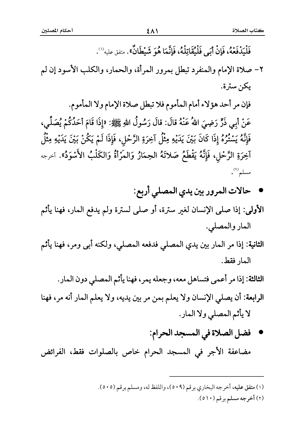 الأولى: إذا صلى الإنسان لغير سترة، أو صلى لسترة ولم يدفع المار، فهنا يأثم المار والمصلي.
