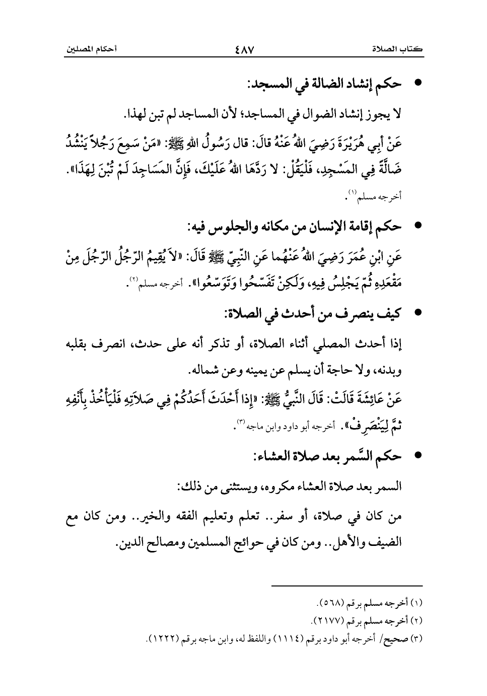 عَنْ أبِي هُرَيْرَةَ رَضِيَ اللهُ عَنْهُ قالَ: قال رَسُولُ اللهِ - صلى الله عليه وسلم -: «مَنْ سَمِعَ رَجُلاً يَنْشُدُ ضَالَّةً فِي المَسْجِدِ، فَلْيَقُلْ: لا رَدَّهَا اللهُ عَلَيْكَ، فَإِنَّ المَسَاجِدَ لَمْ تُبْنَ لِهَذَا». أخرجه مسلم (¬1).