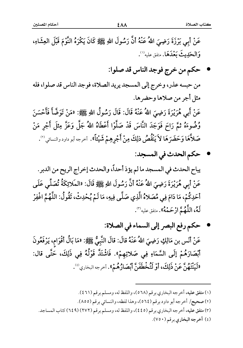 عَنْ أبِي هُرَيْرَةَ رَضِيَ اللهُ عَنْهُ أنَّ رَسُولَ اللهِ - صلى الله عليه وسلم - قَالَ: «المَلائِكَةُ تُصَلِّي عَلَى أحَدِكُمْ، مَا دَامَ فِي مُصَلاهُ الَّذِي صَلَّى فِيهِ، مَا لَمْ يُحْدِثْ، تَقُولُ: اللَّهُمَّ اغْفِرْ لَهُ، اللَّهُمَّ ارْحَمْهُ». متفق عليه (¬3).