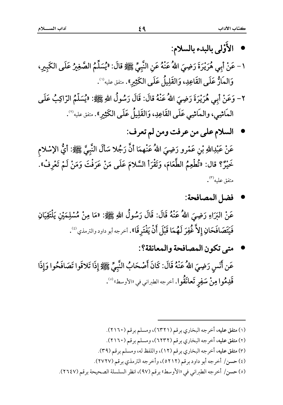 1 - عَنْ أبِي هُرَيْرَةَ رَضِيَ اللهُ عَنْهُ عَنِ النَّبِيِّ - صلى الله عليه وسلم - قالَ: «يُسَلِّمُ الصَّغِيرُ عَلَى الكَبِيرِ، وَالمَارُّ عَلَى القَاعِدِ، وَالقَلِيلُ عَلَى الكَثِيرِ». متفق عليه (¬1).