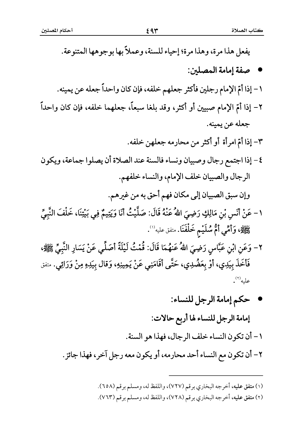1 - عَنْ أنَسِ بْنِ مَالِكٍ رَضِيَ اللهُ عَنْهُ قَالَ: صَلَّيْتُ أنَا وَيَتِيمٌ فِي بَيْتِنَا، خَلْفَ النَّبِيِّ - صلى الله عليه وسلم -، وَأمِّي أمُّ سُلَيْمٍ خَلْفَنَا. متفق عليه (¬1).