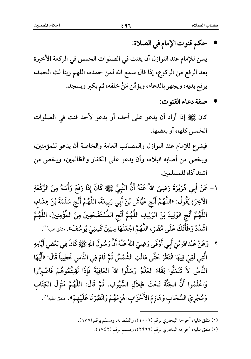1 - عَنْ أَبِي هُرَيْرَةَ رَضِيَ اللهُ عَنْهُ أَنَّ النَّبِيَّ - صلى الله عليه وسلم - كَانَ إِذَا رَفَعَ رَأْسَهُ مِنَ الرَّكْعَةِ الآخِرَةِ يَقُولُ: «اللَّهُمَّ أَنْجِ عَيَّاشَ بْنَ أَبِي رَبِيعَةَ، اللَّهُمَّ أَنْجِ سَلَمَةَ بْنَ هِشَامٍ، اللَّهُمَّ أَنْجِ الوَلِيدَ بْنَ الوَلِيدِ، اللَّهُمَّ أَنْجِ المُسْتَضْعَفِينَ مِنَ المُؤْمِنِينَ، اللَّهُمَّ اشْدُدْ وَطْأَتَكَ عَلَى مُضَرَ، اللَّهُمَّ اجْعَلْهَا سِنِينَ كَسِنِيّ يُوسُفَ». متفق عليه (¬1).