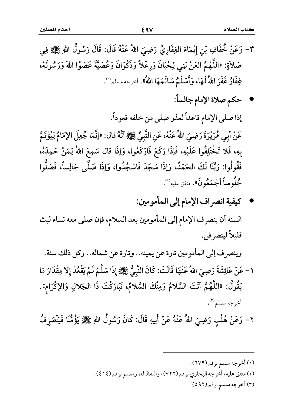 1 - عَنْ عَائِشَةَ رَضِيَ اللهُ عَنْهَا قَالَتْ: كَانَ النَّبِيُّ - صلى الله عليه وسلم - إِذَا سَلَّمَ لَمْ يَقْعُدْ إِلا مِقْدَارَ مَا يَقُولُ: «اللَّهُمَّ أنْتَ السَّلامُ وَمِنْكَ السَّلامُ، تَبَارَكْتَ ذَا الجَلالِ وَالإكْرَامِ».