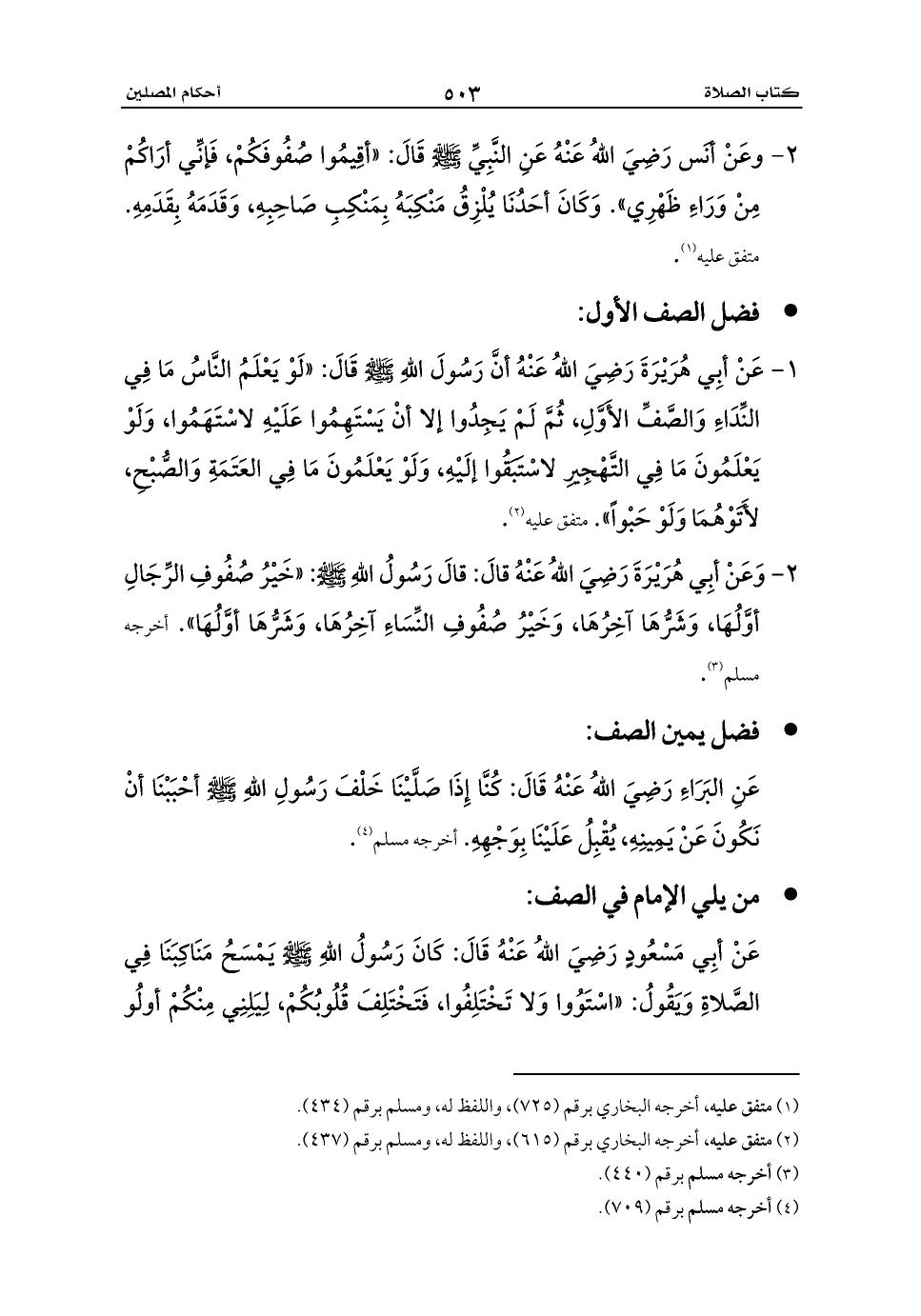 عَنْ أبِي مَسْعُودٍ رَضِيَ اللهُ عَنْهُ قَالَ: كَانَ رَسُولُ اللهِ - صلى الله عليه وسلم - يَمْسَحُ مَنَاكِبَنَا فِي الصَّلاةِ وَيَقُولُ: «اسْتَوُوا وَلا تَخْتَلِفُوا، فَتَخْتَلِفَ قُلُوبُكُمْ، لِيَلِنِي مِنْكُمْ أولُو