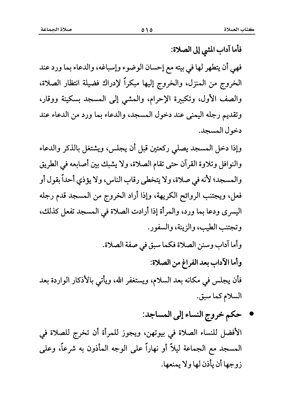 وإذا دخل المسجد يصلي ركعتين قبل أن يجلس، ويشتغل بالذكر والدعاء والنوافل وتلاوة القرآن حتى تقام الصلاة، ولا يشبك بين أصابعه في الطريق والمسجد؛ لأنه في صلاة، ولا يتخطى رقاب الناس، ولا يؤذي أحداً بقول أو فعل، ويجتنب الروائح الكريهة، وإذا أراد الخروج من المسجد قدم رجله اليسرى ودعا بما ورد، والمرأة إذا أرادت الصلاة في المسجد تفعل كذلك، وتجتنب الطيب، والزينة، والسفور.