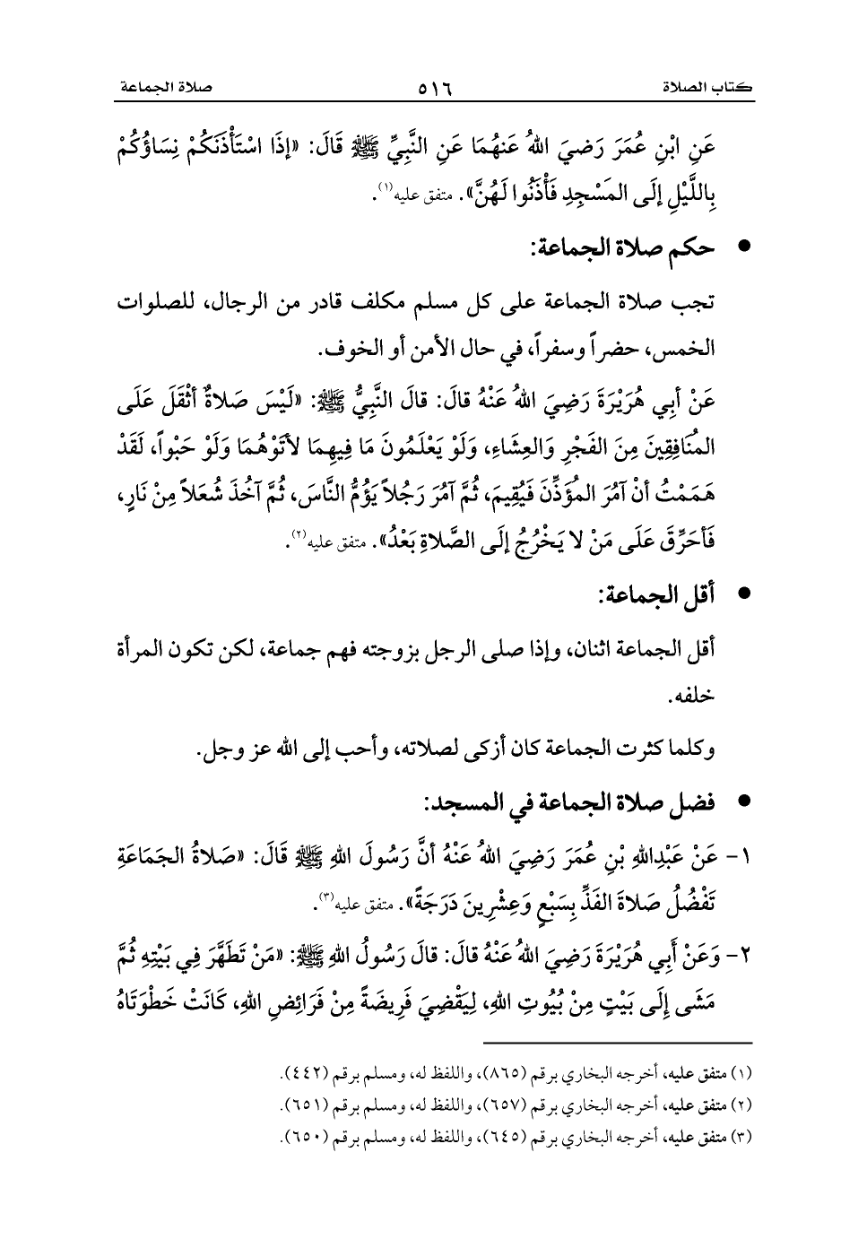 1 - عَنْ عَبْدِاللهِ بْنِ عُمَرَ رَضِيَ اللهُ عَنْهُ أنَّ رَسُولَ اللهِ - صلى الله عليه وسلم - قَالَ: «صَلاةُ الجَمَاعَةِ تَفْضُلُ صَلاةَ الفَذِّ بِسَبْعٍ وَعِشْرِينَ دَرَجَةً». متفق عليه (¬3).