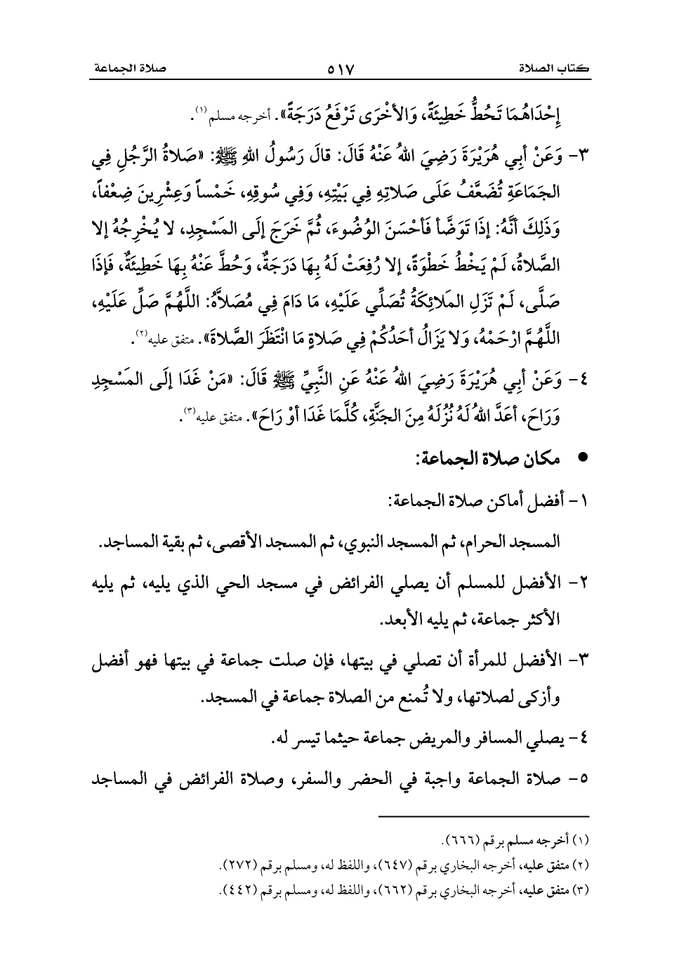 3 - وَعَنْ أبِي هُرَيْرَةَ رَضِيَ اللهُ عَنْهُ قَالَ: قالَ رَسُولُ اللهِ - صلى الله عليه وسلم -: «صَلاةُ الرَّجُلِ فِي الجَمَاعَةِ تُضَعَّفُ عَلَى صَلاتِهِ فِي بَيْتِهِ، وَفِي سُوقِهِ، خَمْساً وَعِشْرِينَ ضِعْفاً، وَذَلِكَ أنَّهُ: إذَا تَوَضَّأ فَأحْسَنَ الوُضُوءَ، ثُمَّ خَرَجَ إلَى المَسْجِدِ، لا يُخْرِجُهُ إلا الصَّلاةُ، لَمْ يَخْطُ خَطْوَةً، إلا رُفِعَتْ لَهُ بِهَا دَرَجَةٌ، وَحُطَّ عَنْهُ بِهَا خَطِيئَةٌ، فَإذَا صَلَّى، لَمْ تَزَلِ المَلائِكَةُ تُصَلِّي عَلَيْهِ، مَا دَامَ فِي مُصَلاَّهُ: اللَّهُمَّ صَلِّ عَلَيْهِ، اللَّهُمَّ ارْحَمْهُ، وَلا يَزَالُ أحَدُكُمْ فِي صَلاةٍ مَا انْتَظَرَ الصَّلاةَ». متفق عليه (¬2).