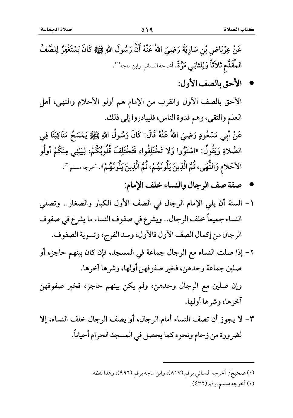 عَنْ عِرْبَاضِ بْنِ سَارِيَةَ رَضِيَ اللهُ عَنْهُ أَنَّ رَسُولَ اللهِ - صلى الله عليه وسلم - كَانَ يَسْتَغْفِرُ لِلصَّفِّ المُقَدَّمِ ثلاَثاً وَلِلثانِي مَرَّةً. أخرجه النسائي وابن ماجه (¬1).