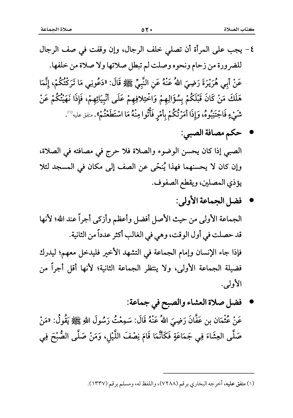 4 - يجب على المرأة أن تصلي خلف الرجال، وإن وقفت في صف الرجال للضرورة من زحام ونحوه وصلت لم تبطل صلاتها ولا صلاة من خلفها.