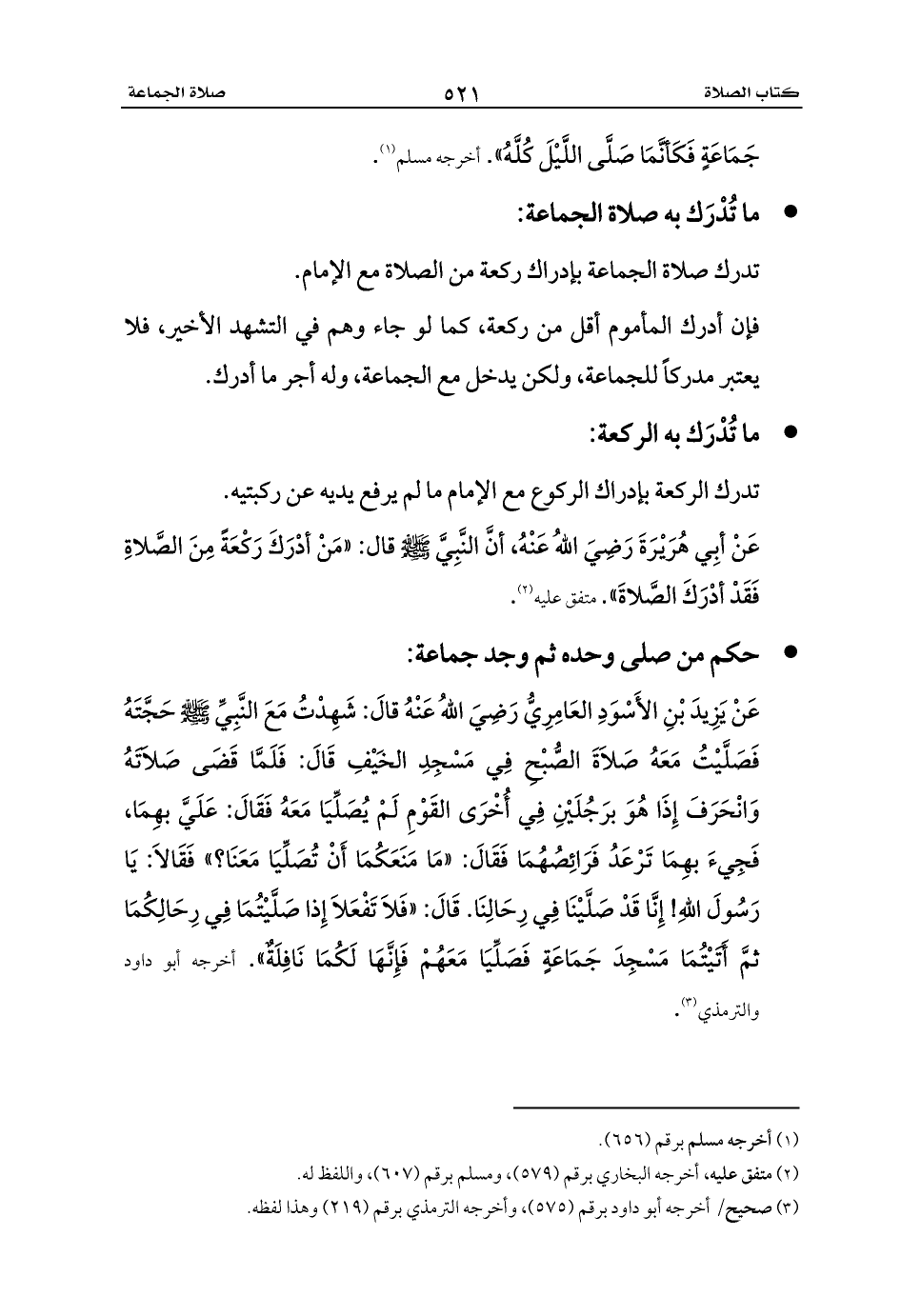 عَنْ يَزِيدَ بْنِ الأَسْوَدِ العَامِرِيُّ رَضِيَ اللهُ عَنْهُ قالَ: شَهِدْتُ مَعَ النَّبِيِّ - صلى الله عليه وسلم - حَجَّتَهُ فَصَلَّيْتُ مَعَهُ صَلاَةَ الصُّبْحِ فِي مَسْجِدِ الخَيْفِ قَالَ: فَلَمَّا قَضَى صَلاَتَهُ وَانْحَرَفَ إِذَا هُوَ برَجُلَيْنِ فِي أُخْرَى القَوْمِ لَمْ يُصَلِّيَا مَعَهُ فَقَالَ: عَلَيَّ بهِمَا، فَجِيءَ بهِمَا تَرْعَدُ فَرَائِصُهُمَا فَقَالَ: «مَا مَنَعَكُمَا أَنْ تُصَلِّيَا مَعَنَا؟» فَقَالاَ: يَا رَسُولَ اللهِ! إِنَّا قَدْ صَلَّيْنَا فِي رِحَالِنَا. قَالَ: «فَلاَ تَفْعَلاَ إِذا صَلَّيْتُمَا فِي رِحَالِكُمَا ثمَّ أَتَيْتُمَا مَسْجِدَ جَمَاعَةٍ فَصَلِّيَا مَعَهُمْ فَإِنَّهَا لَكُمَا نَافِلَةٌ». أخرجه أبو داود والترمذي (¬3).