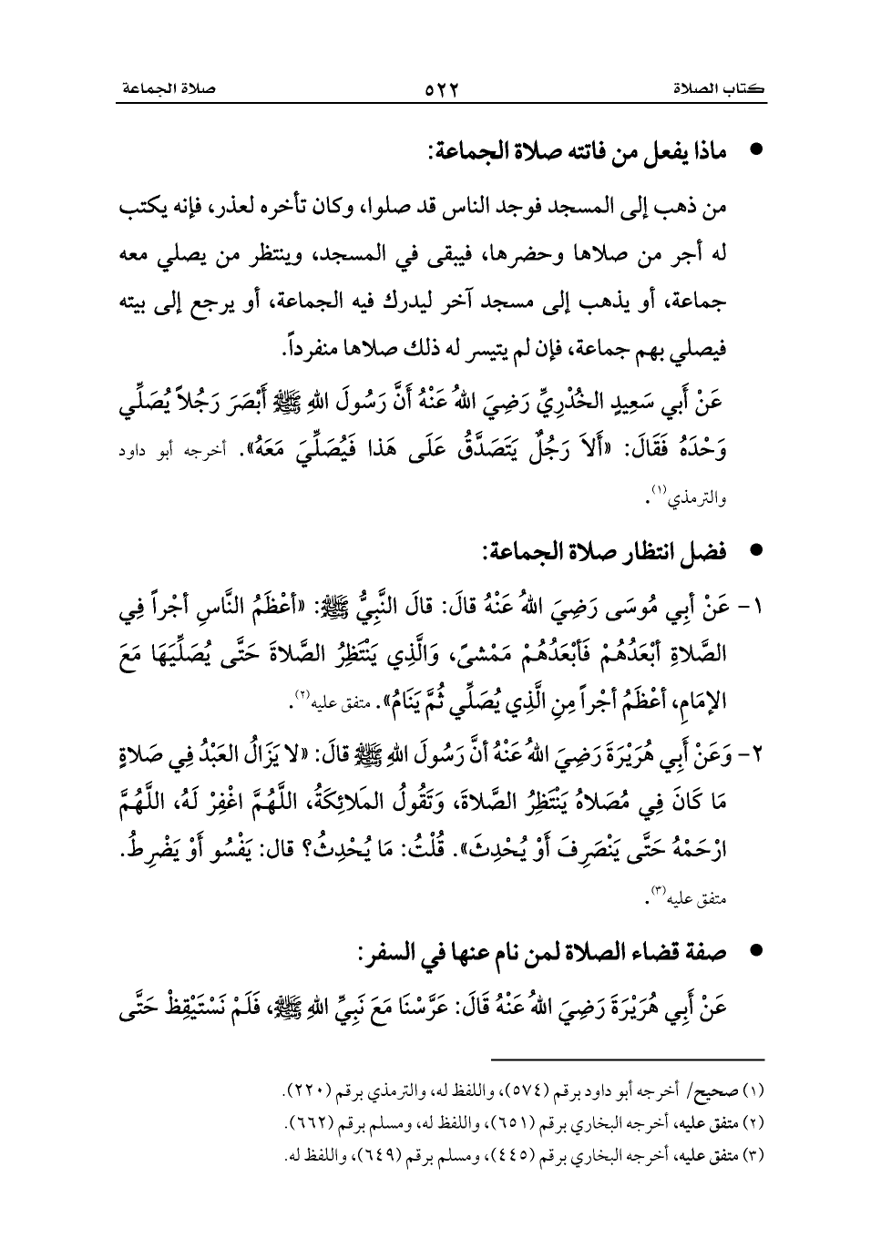 1 - عَنْ أبِي مُوسَى رَضِيَ اللهُ عَنْهُ قالَ: قالَ النَّبِيُّ - صلى الله عليه وسلم -: «أعْظَمُ النَّاسِ أجْراً فِي الصَّلاةِ أبْعَدُهُمْ فَأبْعَدُهُمْ مَمْشىً، وَالَّذِي يَنْتَظِرُ الصَّلاةَ حَتَّى يُصَلِّيَهَا مَعَ الإمَامِ، أعْظَمُ أجْراً مِنِ الَّذِي يُصَلِّي ثُمَّ يَنَامُ». متفق عليه (¬2).
