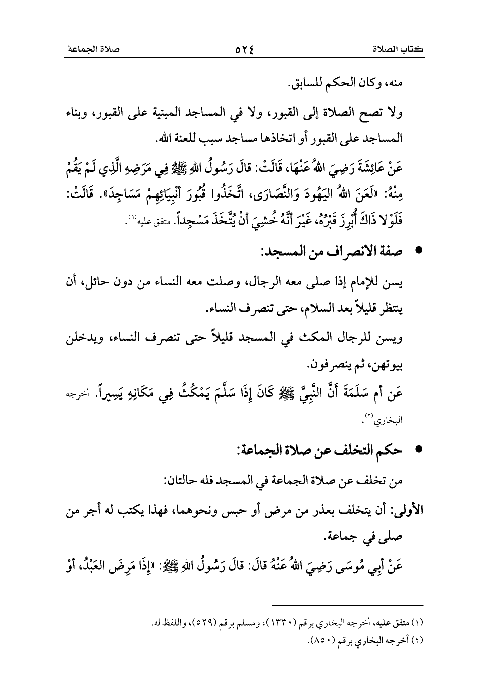 ولا تصح الصلاة إلى القبور، ولا في المساجد المبنية على القبور، وبناء المساجد على القبور أو اتخاذها مساجد سبب للعنة الله.