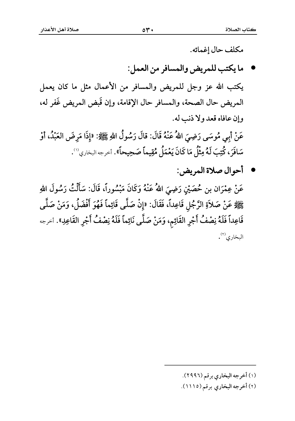 عَنْ عِمْرَان بن حُصَيْنٍ رَضِيَ اللهُ عَنْهُ وَكَانَ مَبْسُوراً، قَالَ: سَأَلْتُ رَسُولَ اللهِ - صلى الله عليه وسلم - عَنْ صَلاَةِ الرَّجُلِ قَاعِداً، فَقَالَ: «إِنْ صَلَّى قَائِماً فَهُوَ أَفْضَلُ، وَمَنْ صَلَّى قَاعِداً فَلَهُ نِصْفُ أَجْرِ القَائِمِ، وَمَنْ صَلَّى نَائِماً فَلَهُ نِصْفُ أَجْرِ القَاعِدِ». أخرجه البخاري (¬2).