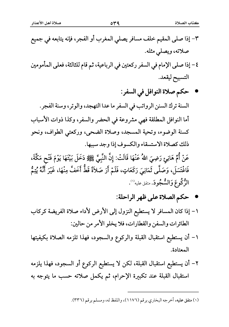 3 - إذا صلى المقيم خلف مسافر يصلي المغرب أو الفجر، فإنه يتابعه في جميع صلاته، ويصلي مثله.