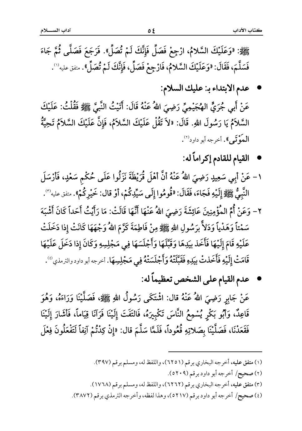 عَنْ أَبي جُرَيٍّ الهُجَيْمِيِّ رَضِيَ اللهُ عَنْهُ قَالَ: أَتَيْتُ النَّبيَّ - صلى الله عليه وسلم - فَقُلْتُ: عَلَيْكَ السَّلاَمُ يَا رَسُولَ اللهِ. قَالَ: «لاَ تَقُلْ عَلَيْكَ السَّلاَمُ، فَإِنَّ عَلَيْكَ السَّلاَمُ تَحِيَّةُ المَوْتَى». أخرجه أبو داود (¬2).
