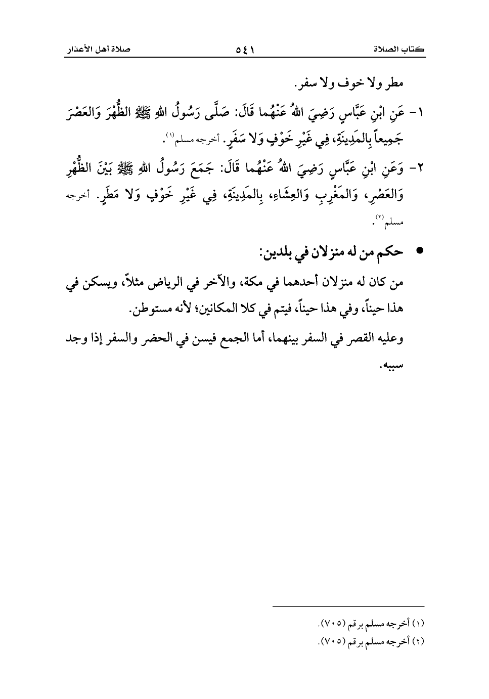 2 - وَعَنِ ابْنِ عَبَّاسٍ رَضِيَ اللهُ عَنْهُما قَالَ: جَمَعَ رَسُولُ اللهِ - صلى الله عليه وسلم - بَيْنَ الظُّهْرِ وَالعَصْرِ، وَالمَغْرِبِ وَالعِشَاءِ، بِالمَدِينَةِ، فِي غَيْرِ خَوْفٍ وَلا مَطَرٍ. أخرجه مسلم (¬2).