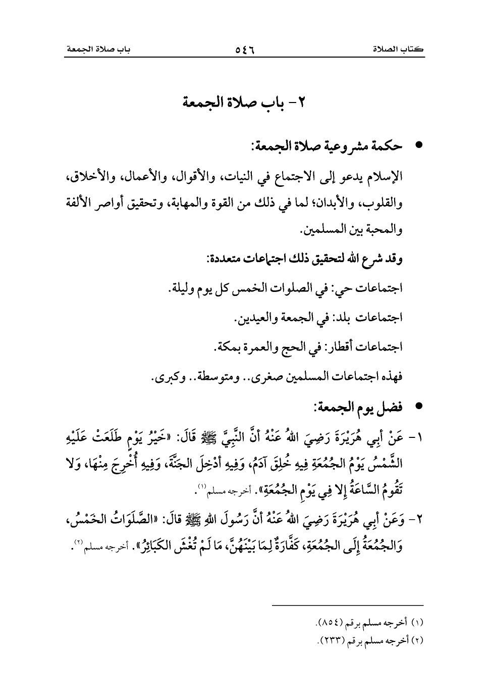 1 - عَنْ أبِي هُرَيْرَةَ رَضِيَ اللهُ عَنْهُ أنَّ النَّبِيَّ - صلى الله عليه وسلم - قَالَ: «خَيْرُ يَوْمٍ طَلَعَتْ عَلَيْهِ الشَّمْسُ يَوْمُ الجُمُعَةِ فِيهِ خُلِقَ آدَمُ، وَفِيهِ أدْخِلَ الجَنَّةَ، وَفِيهِ أُخْرِجَ مِنْهَا، وَلا تَقُومُ السَّاعَةُ إِلا فِي يَوْمِ الجُمُعَةِ». أخرجه مسلم (¬1).