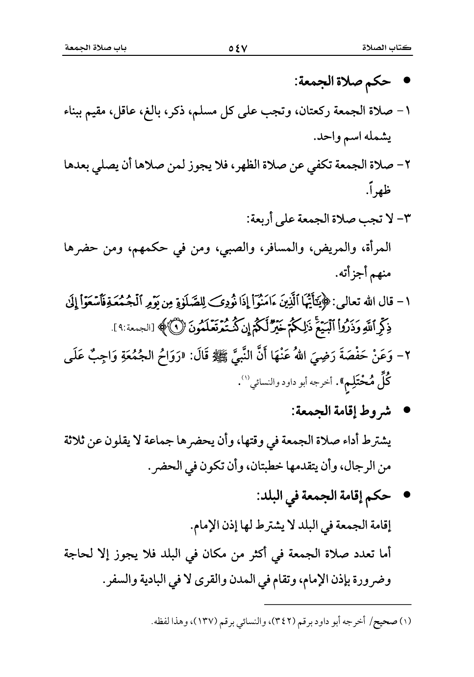 1 - صلاة الجمعة ركعتان، وتجب على كل مسلم، ذكر، بالغ، عاقل، مقيم ببناء يشمله اسم واحد.