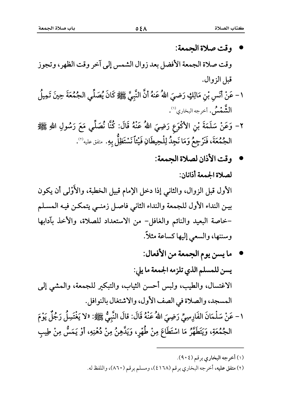 1 - عَنْ أنَسِ بْنِ مَالِكٍ رَضيَ اللهُ عَنهُ أنَّ النَّبِيَّ - صلى الله عليه وسلم - كَانَ يُصَلِّي الجُمُعَةَ حِينَ تَمِيلُ الشَّمْسُ. أخرجه البخاري (¬1).