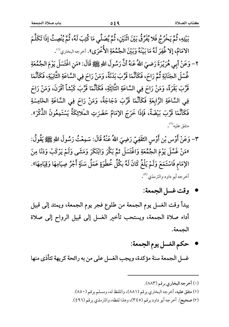 3 - وَعَنْ أَوْس بْن أَوْسٍ الثقَفِيّ رَضِيَ اللهُ عَنْهُ قَالَ: سَمِعْتُ رَسُولَ اللهِ - صلى الله عليه وسلم - يَقُولُ: «مَنْ غَسَّلَ يَوْمَ الجُمُعَةِ وَاغْتَسَلَ ثمَّ بَكَّرَ وَابْتَكَرَ وَمَشَى وَلَمْ يَرْكَبْ وَدَنَا مِنَ الإمَامِ فَاسْتَمَعَ وَلَمْ يَلْغُ كَانَ لَهُ بكُلِّ خُطْوَةٍ عَمَلُ سَنَةٍ أَجْرُ صِيَامِهَا وَقِيَامِهَا». أخرجه أبو داود والترمذي (¬3).