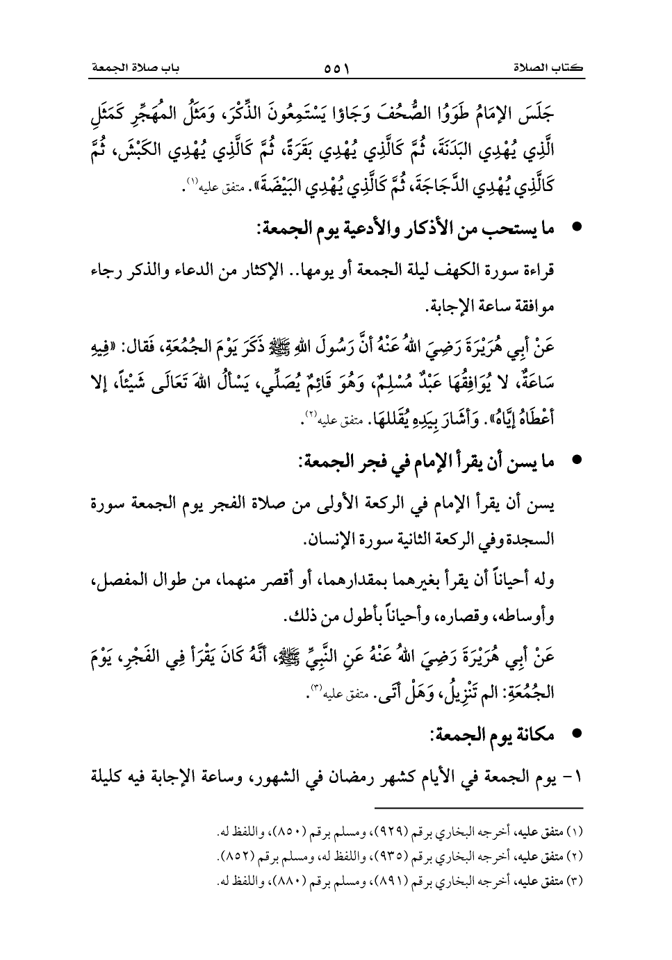 عَنْ أبِي هُرَيْرَةَ رَضِيَ اللهُ عَنْهُ عَنِ النَّبِيِّ - صلى الله عليه وسلم -، أنَّهُ كَانَ يَقْرَأ فِي الفَجْرِ، يَوْمَ الجُمُعَةِ: الم تَنْزِيلُ، وَهَلْ أتَى. متفق عليه (¬3).