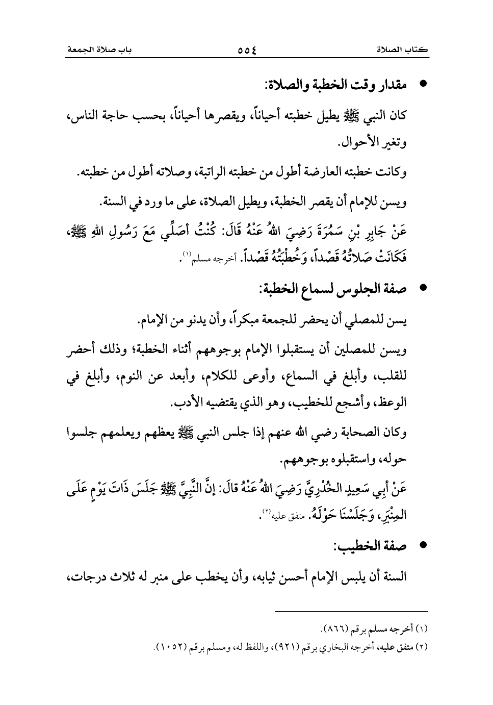 عَنْ جَابِرِ بْنِ سَمُرَةَ رَضِيَ اللهُ عَنْهُ قَالَ: كُنْتُ أصَلِّي مَعَ رَسُولِ اللهِ - صلى الله عليه وسلم -، فَكَانَتْ صَلاتُهُ قَصْداً، وَخُطْبَتُهُ قَصْداً. أخرجه مسلم (¬1).