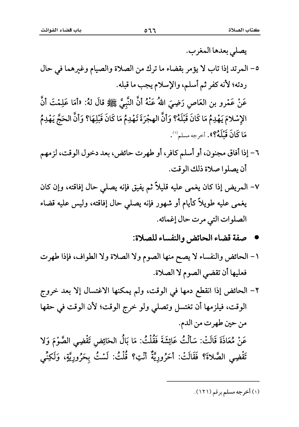 عَنْ مُعَاذَةَ قَالَتْ: سَألْتُ عَائِشَةَ فَقُلْتُ: مَا بَالُ الحَائِضِ تَقْضِي الصَّوْمَ وَلا تَقْضِي الصَّلاةَ؟ فَقَالَتْ: أحَرُورِيَّةٌ أنْتِ؟ قُلْتُ: لَسْتُ بِحَرُورِيَّةٍ، وَلَكِنِّي