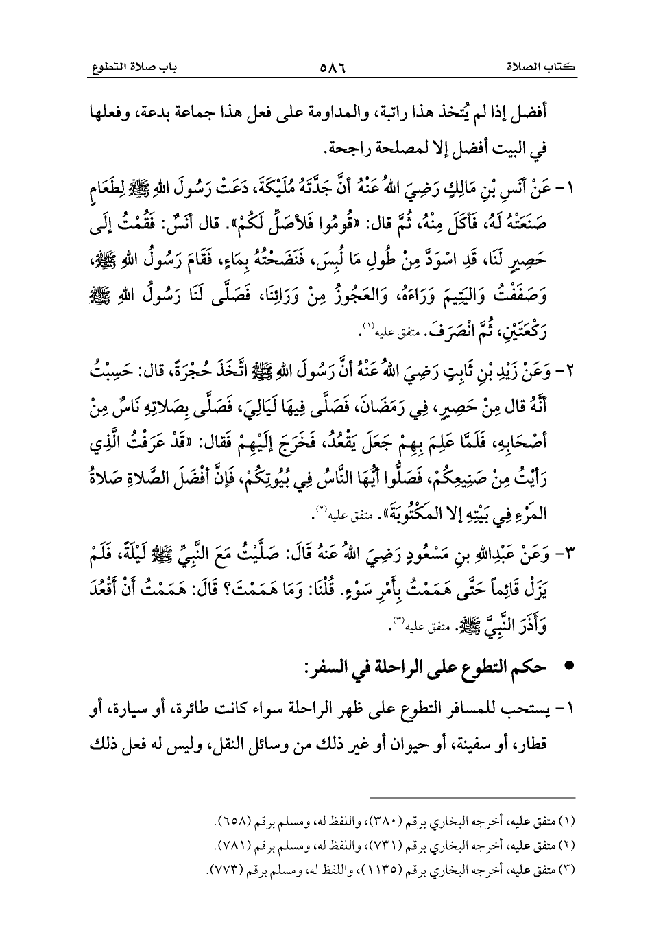 1 - يستحب للمسافر التطوع على ظهر الراحلة سواء كانت طائرة، أو سيارة، أو قطار، أو سفينة، أو حيوان أو غير ذلك من وسائل النقل، وليس له فعل ذلك