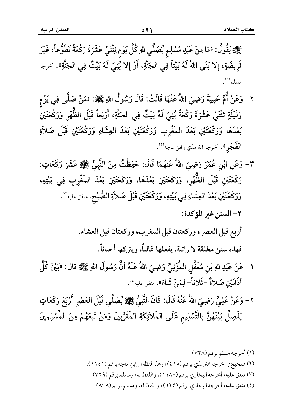 2 - وَعَنْ أُمِّ حَبيبَةَ رَضِيَ اللهُ عَنْهَا قَالَتْ: قَالَ رَسُولُ اللهِ - صلى الله عليه وسلم -: «مَنْ صَلَّى فِي يَوْمٍ وَلَيْلَةٍ ثنْتَيْ عَشْرَةَ رَكْعَةً بُنِيَ لَهُ بَيْتٌ فِي الجَنَّةِ، أَرْبَعاً قَبْلَ الظُّهْرِ وَرَكْعَتَيْنِ بَعْدَهَا وَرَكْعَتَيْنِ بَعْدَ المَغْرِب وَرَكْعَتَيْنِ بَعْدَ العِشَاءِ وَرَكْعَتَيْنِ قَبْلَ صَلاَةِ الفَجْرِ». أخرجه الترمذي وابن ماجه (¬2).