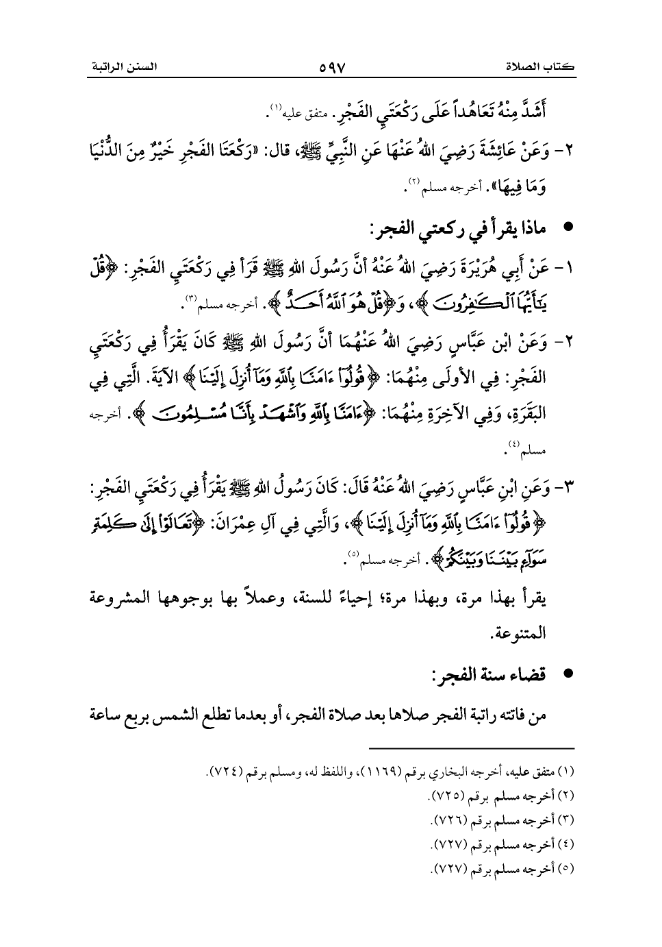 1 - عَنْ أَبِي هُرَيْرَةَ رَضِيَ اللهُ عَنْهُ أنَّ رَسُولَ اللهِ - صلى الله عليه وسلم - قَرَأ فِي رَكْعَتَيِ الفَجْرِ: {قُلْ يَاأَيُّهَا الْكَافِرُونَ}، وَ {قُلْ هُوَ اللَّهُ أَحَدٌ}. أخرجه مسلم (¬3).