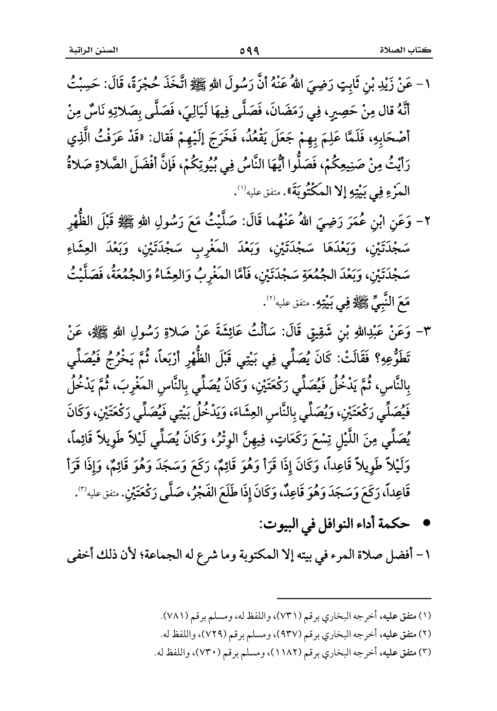 1 - عَنْ زَيْدِ بْنِ ثَابِتٍ رَضِيَ اللهُ عَنْهُ أنَّ رَسُولَ اللهِ - صلى الله عليه وسلم - اتَّخَذَ حُجْرَةً، قَالَ: حَسِبْتُ أنَّهُ قال مِنْ حَصِيرٍ، فِي رَمَضَانَ، فَصَلَّى فِيهَا لَيَالِيَ، فَصَلَّى بِصَلاتِهِ نَاسٌ مِنْ أصْحَابِهِ، فَلَمَّا عَلِمَ بِهِمْ جَعَلَ يَقْعُدُ، فَخَرَجَ إلَيْهِمْ فَقال: «قَدْ عَرَفْتُ الَّذِي رَأيْتُ مِنْ صَنِيعِكُمْ، فَصَلُّوا أيُّهَا النَّاسُ فِي بُيُوتِكُمْ، فَإنَّ أفْضَلَ الصَّلاةِ صَلاةُ المَرْءِ فِي بَيْتِهِ إلا المَكْتُوبَةَ». متفق عليه (¬1).