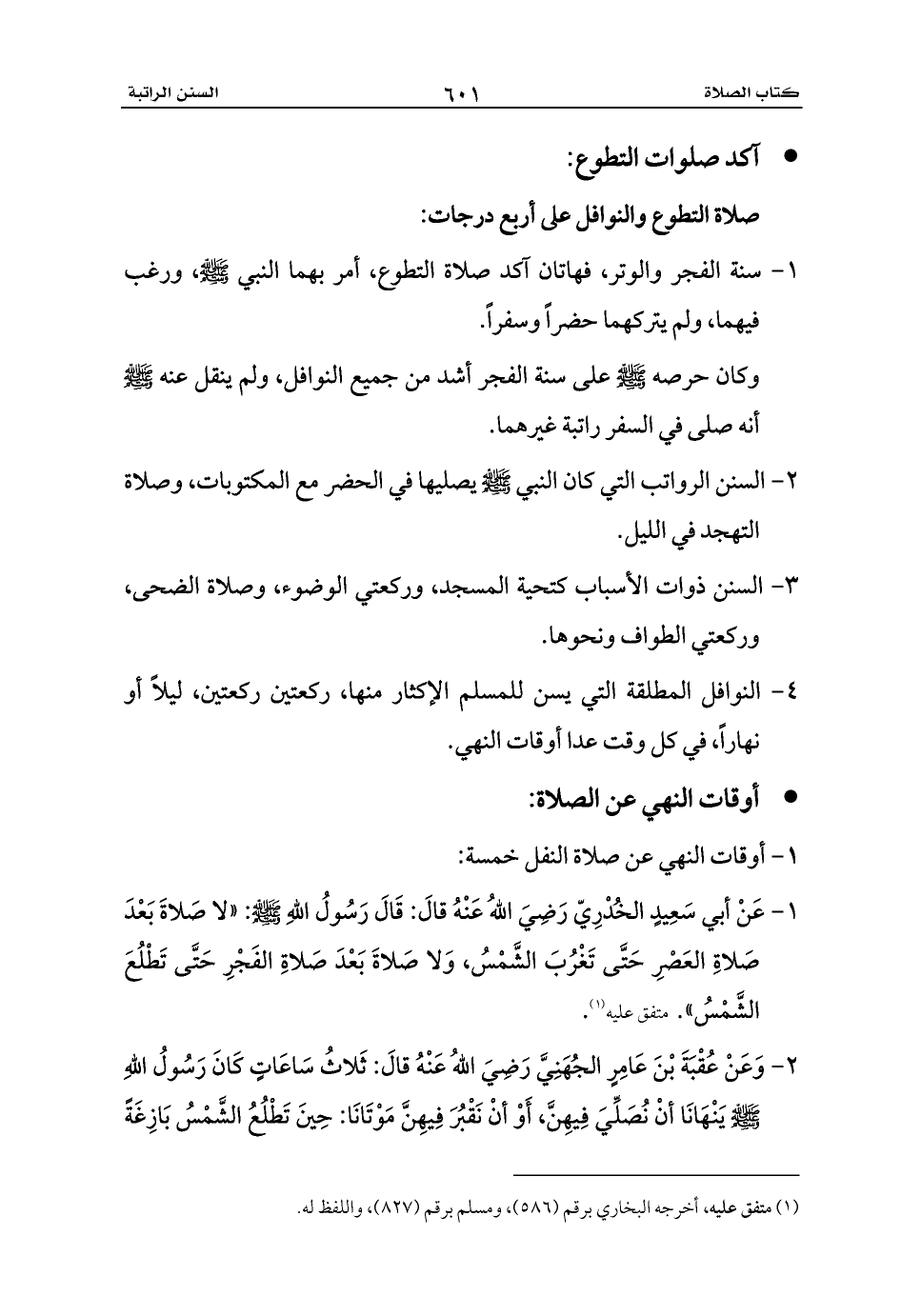 1 - عَنْ أبي سَعِيدٍ الخُدْرِيّ رَضِيَ اللهُ عَنْهُ قالَ: قَالَ رَسُولُ اللهِ - صلى الله عليه وسلم -: «لا صَلاةَ بَعْدَ صَلاةِ العَصْرِ حَتَّى تَغْرُبَ الشَّمْسُ، وَلا صَلاةَ بَعْدَ صَلاةِ الفَجْرِ حَتَّى تَطْلُعَ الشَّمْسُ». متفق عليه (¬1).
