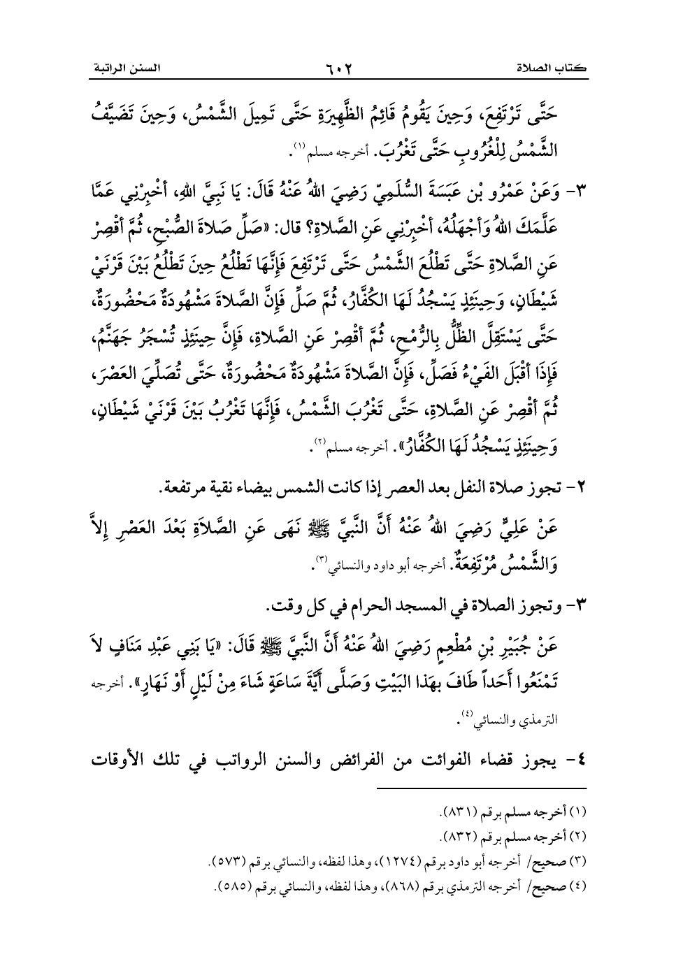 4 - يجوز قضاء الفوائت من الفرائض والسنن الرواتب في تلك الأوقات