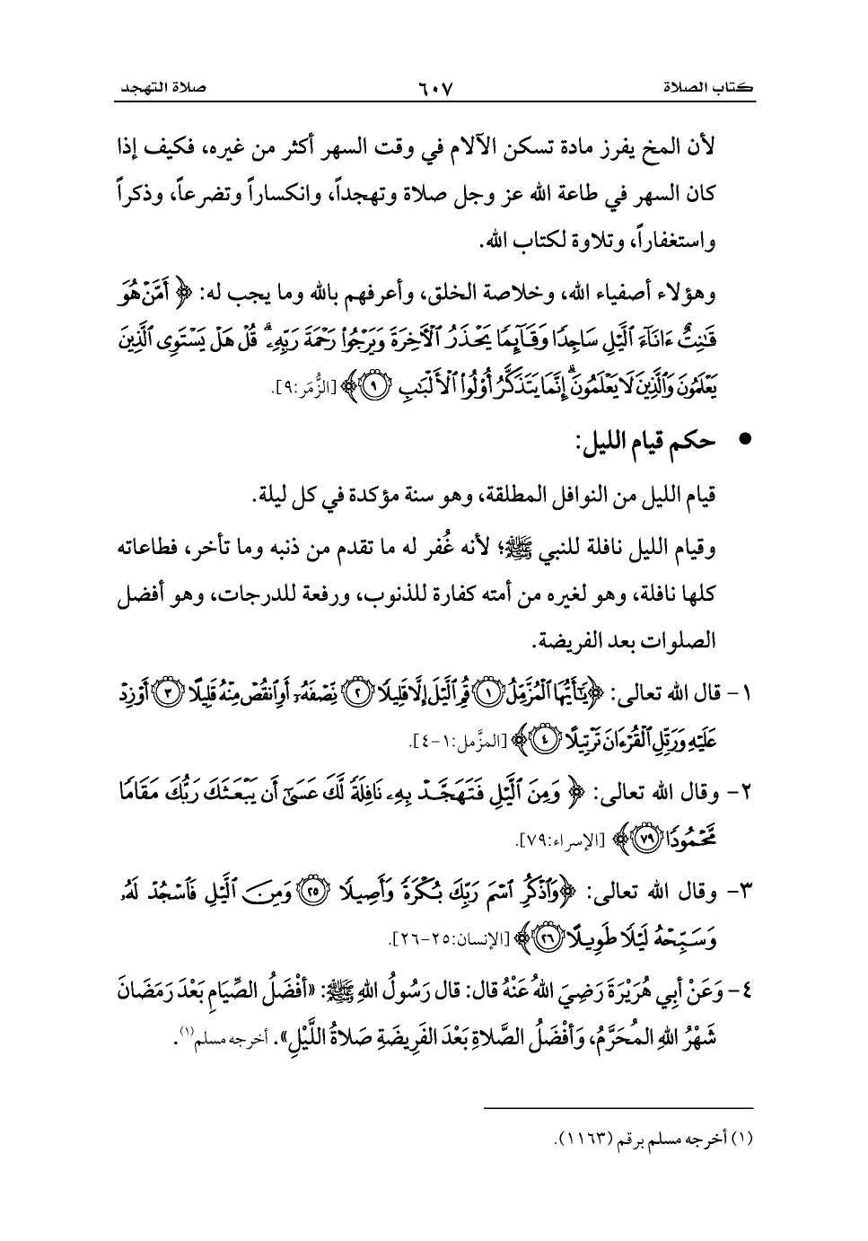 1 - قال الله تعالى: {يَاأَيُّهَا الْمُزَّمِّلُ (1) قُمِ اللَّيْلَ إِلَّا قَلِيلًا (2) نِصْفَهُ أَوِ انْقُصْ مِنْهُ قَلِيلًا (3) أَوْ زِدْ عَلَيْهِ وَرَتِّلِ الْقُرْآنَ تَرْتِيلًا (4)} [المزَّمل:1 - 4].