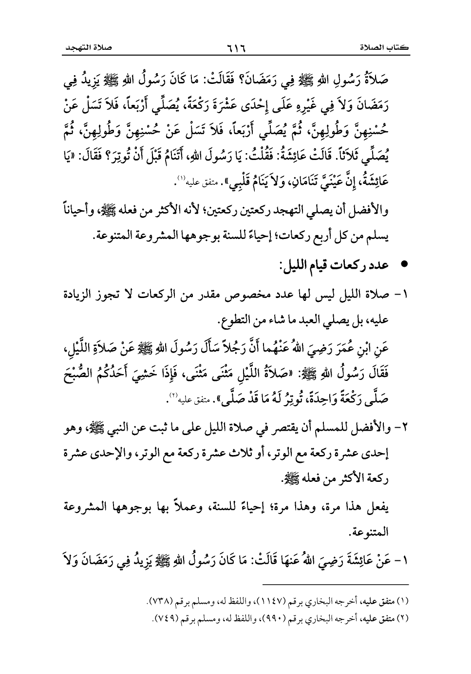 1 - عَنْ عَائِشَةَ رَضِيَ اللهُ عَنهَا قَالَتْ: مَا كَانَ رَسُولُ اللهِ - صلى الله عليه وسلم - يَزِيدُ فِي رَمَضَانَ وَلاَ