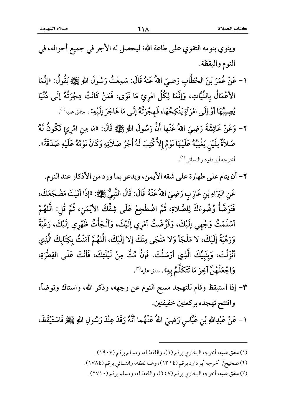 1 - عَنْ عَبْدِاللهِ بْنِ عَبَّاسٍ رَضِيَ اللهُ عَنْهُما أنَّهُ رَقَدَ عِنْدَ رَسُولِ اللهِ - صلى الله عليه وسلم - فَاسْتَيْقَظَ،
