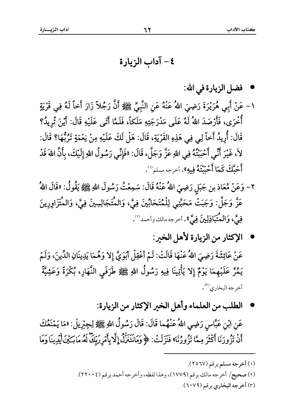 1 - عَنْ أَبِي هُرَيْرَةَ رَضِيَ اللهُ عَنْهُ عَنِ النَّبِيِّ - صلى الله عليه وسلم - أَنَّ رَجُلاً زَارَ أَخاً لَهُ فِي قَرْيَةٍ أُخْرَى، فَأَرْصَدَ اللهُ لَهُ عَلَى مَدْرَجَتِهِ مَلَكاً، فَلَمَّا أَتَى عَلَيْهِ قَالَ: أَيْنَ تُرِيدُ؟ قَالَ: أُرِيدُ أَخاً لِي فِي هَذِهِ القَرْيَةِ، قَالَ: هَلْ لَكَ عَلَيْهِ مِنْ نِعْمَةٍ تَرُبُّهَا؟ قَالَ: لاَ، غَيْرَ أَنِّي أَحْبَبْتُهُ فِي اللهِ عَزَّ وَجَلَّ، قَالَ: «فَإِنِّي رَسُولُ اللهِ إِلَيْكَ، بِأَنَّ اللهَ قَدْ أَحَبَّكَ كَمَا أَحْبَبْتَهُ فِيهِ». أخرجه مسلم (¬1).