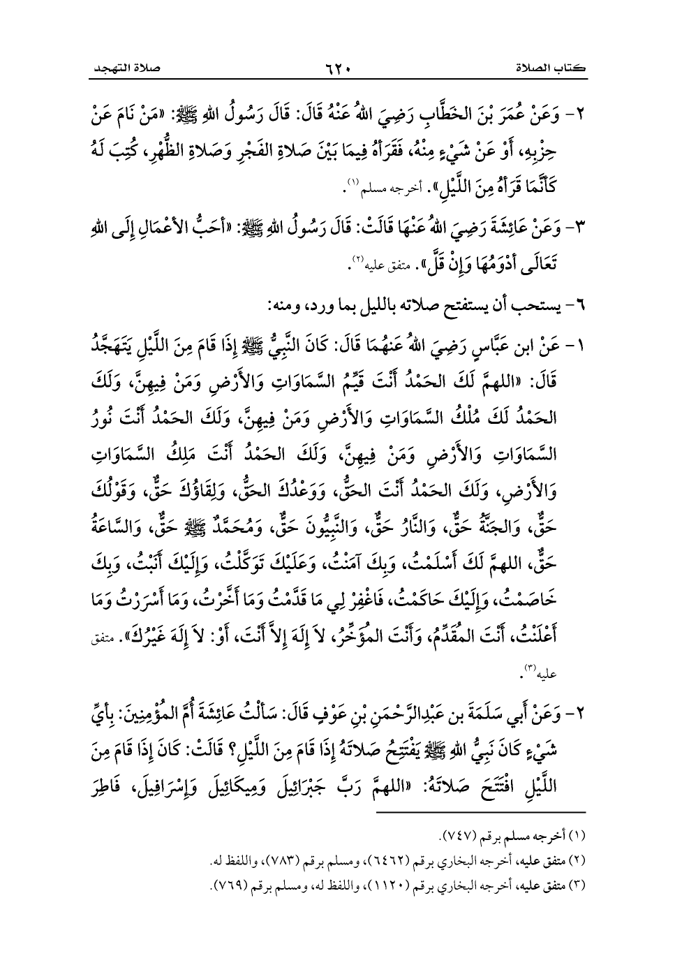 1 - عَنْ ابن عَبَّاسٍ رَضِيَ اللهُ عَنهُمَا قَالَ: كَانَ النَّبِيُّ - صلى الله عليه وسلم - إِذَا قَامَ مِنَ اللَّيْلِ يَتَهَجَّدُ قَالَ: «اللهمَّ لَكَ الحَمْدُ أَنْتَ قَيِّمُ السَّمَاوَاتِ وَالأَرْضِ وَمَنْ فِيهِنَّ، وَلَكَ الحَمْدُ لَكَ مُلْكُ السَّمَاوَاتِ وَالأَرْضِ وَمَنْ فِيهِنَّ، وَلَكَ الحَمْدُ أَنْتَ نُورُ السَّمَاوَاتِ وَالأَرْضِ وَمَنْ فِيهِنَّ، وَلَكَ الحَمْدُ أَنْتَ مَلِكُ السَّمَاوَاتِ وَالأَرْضِ، وَلَكَ الحَمْدُ أَنْتَ الحَقُّ، وَوَعْدُكَ الحَقُّ، وَلِقَاؤُكَ حَقٌّ، وَقَوْلُكَ حَقٌّ، وَالجَنَّةُ حَقٌّ، وَالنَّارُ حَقٌّ، وَالنَّبِيُّونَ حَقٌّ، وَمُحَمَّدٌ - صلى الله عليه وسلم - حَقٌّ، وَالسَّاعَةُ حَقٌّ، اللهمَّ لَكَ أَسْلَمْتُ، وَبِكَ آمَنْتُ، وَعَلَيْكَ تَوَكَّلْتُ، وَإِلَيْكَ أَنَبْتُ، وَبِكَ خَاصَمْتُ، وَإِلَيْكَ حَاكَمْتُ، فَاغْفِرْ لِي مَا قَدَّمْتُ وَمَا أَخَّرْتُ، وَمَا أَسْرَرْتُ وَمَا أَعْلَنْتُ، أَنْتَ المُقَدِّمُ، وَأَنْتَ المُؤَخِّرُ، لاَ إِلَهَ إِلاَّ أَنْتَ، أَوْ: لاَ إِلَهَ غَيْرُكَ». متفق عليه (¬3).