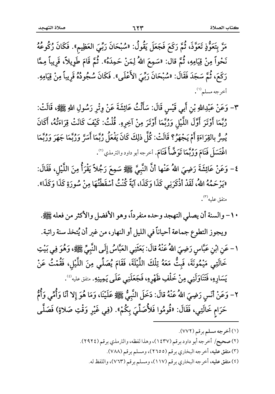 3 - وَعَنْ عَبْدِاللهِ بْنِ أَبي قَيْسٍ قَالَ: سَأَلْتُ عَائِشَةَ عَنْ وِتْرِ رَسُولِ اللهِ - صلى الله عليه وسلم -، قَالَتْ: رُبَّمَا أَوْتَرَ أَوَّلَ اللَّيْلِ وَرُبَّمَا أَوْتَرَ مِنْ آخِرِهِ. قُلْتُ: كَيْفَ كَانَتْ قِرَاءَتُهُ، أَكَانَ يُسِرُّ بالقِرَاءَةِ أَمْ يَجْهَرُ؟ قَالَتْ: كُلَّ ذلِكَ كَانَ يَفْعَلُ رُبَّمَا أَسَرَّ وَرُبَّمَا جَهَرَ وَرُبَّمَا اغْتَسَلَ فَنَامَ وَرُبَّمَا تَوَضَّأَ فَنَامَ. أخرجه أبو داود والترمذي (¬2).