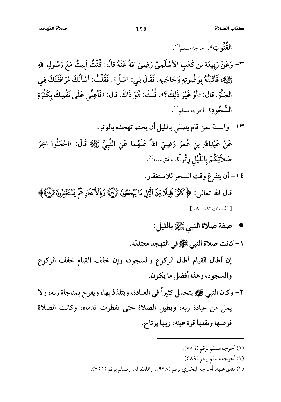 3 - وَعَنْ رَبِيعَة بن كَعْبٍ الأسْلَمِيّ رَضِيَ اللهُ عَنْهُ قالَ: كُنْتُ أبِيتُ مَعَ رَسُولِ اللهِ - صلى الله عليه وسلم -، فَأتَيْتُهُ بِوَضُوئِهِ وَحَاجَتِهِ. فَقَالَ لِي: «سَلْ». فَقُلْتُ: أسْألُكَ مُرَافَقَتَكَ فِي الجَنَّةِ. قال: «أوْ غَيْرَ ذَلِكَ؟». قُلْتُ: هُوَ ذَاكَ. قال: «فَأعِنِّي عَلَى نَفْسِكَ بِكَثْرَةِ السُّجُودِ». أخرجه مسلم (¬2).