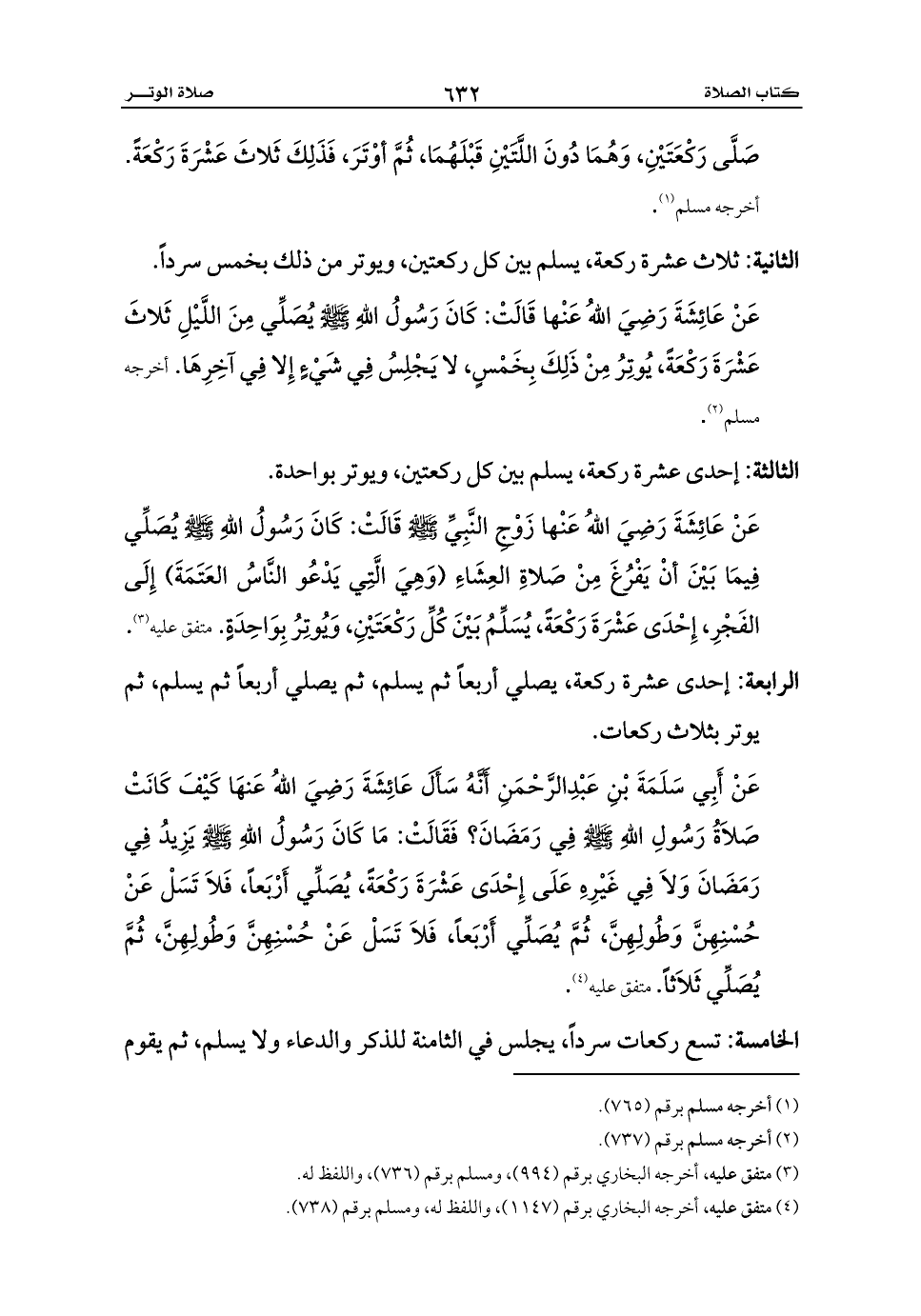 الرابعة: إحدى عشرة ركعة، يصلي أربعاً ثم يسلم، ثم يصلي أربعاً ثم يسلم، ثم يوتر بثلاث ركعات.