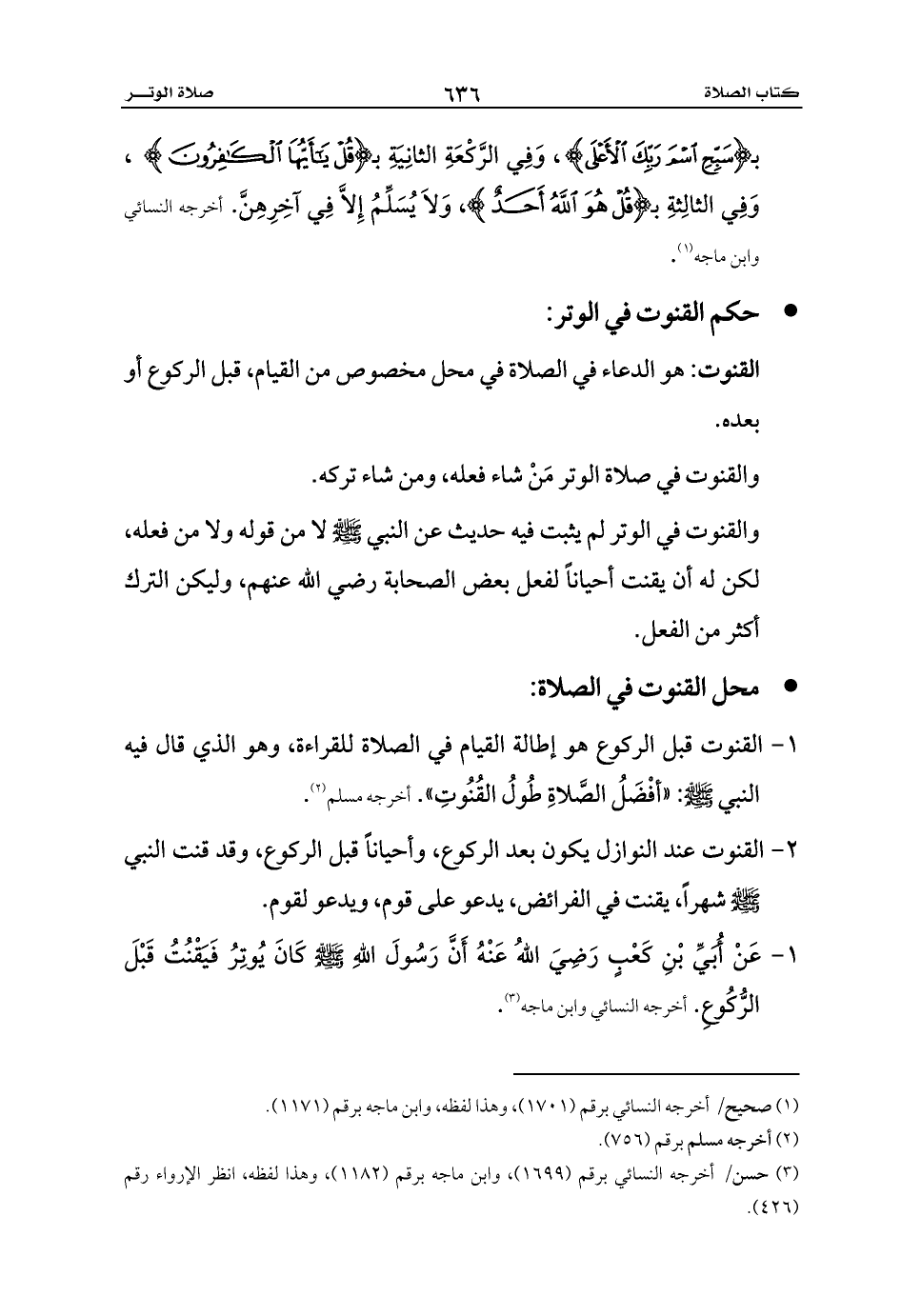 1 - عَنْ أُبَيِّ بْنِ كَعْبٍ رَضِيَ اللهُ عَنْهُ أَنَّ رَسُولَ اللهِ - صلى الله عليه وسلم - كَانَ يُوتِرُ فَيَقْنُتُ قَبْلَ