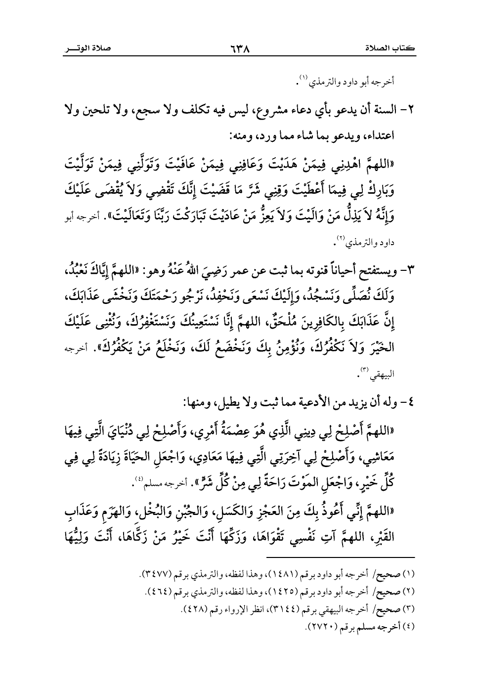 «اللهمَّ اهْدِنِي فِيمَنْ هَدَيْتَ وَعَافِنِي فِيمَنْ عَافَيْتَ وَتَوَلَّنِي فِيمَنْ تَوَلَّيْتَ وَبَارِكْ لِي فِيمَا أَعْطَيْتَ وَقِنِي شَرَّ مَا قَضَيْتَ إِنَّكَ تَقْضِي وَلاَ يُقْضَى عَلَيْكَ وَإِنَّهُ لاَ يَذِلُّ مَنْ وَالَيْتَ وَلاَ يَعِزُّ مَنْ عَادَيْتَ تَبَارَكْتَ رَبَّنَا وَتَعَالَيْتَ». أخرجه أبو داود والترمذي (¬2).