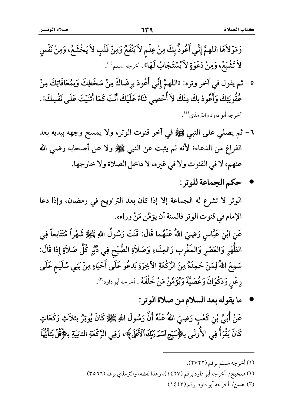 5 - ثم يقول في آخر وتره: «اللهمَّ إِنِّي أَعُوذ برِضَاكَ مِنْ سَخَطِكَ وَبمُعَافَاتِكَ مِنْ عُقُوبَتِكَ وَأَعُوذ بكَ مِنْكَ لاَ أُحْصِي ثنَاءً عَلَيْكَ أَنْتَ كَمَا أَثنَيْتَ عَلَى نَفْسِكَ». أخرجه أبو داود والترمذي (¬2).