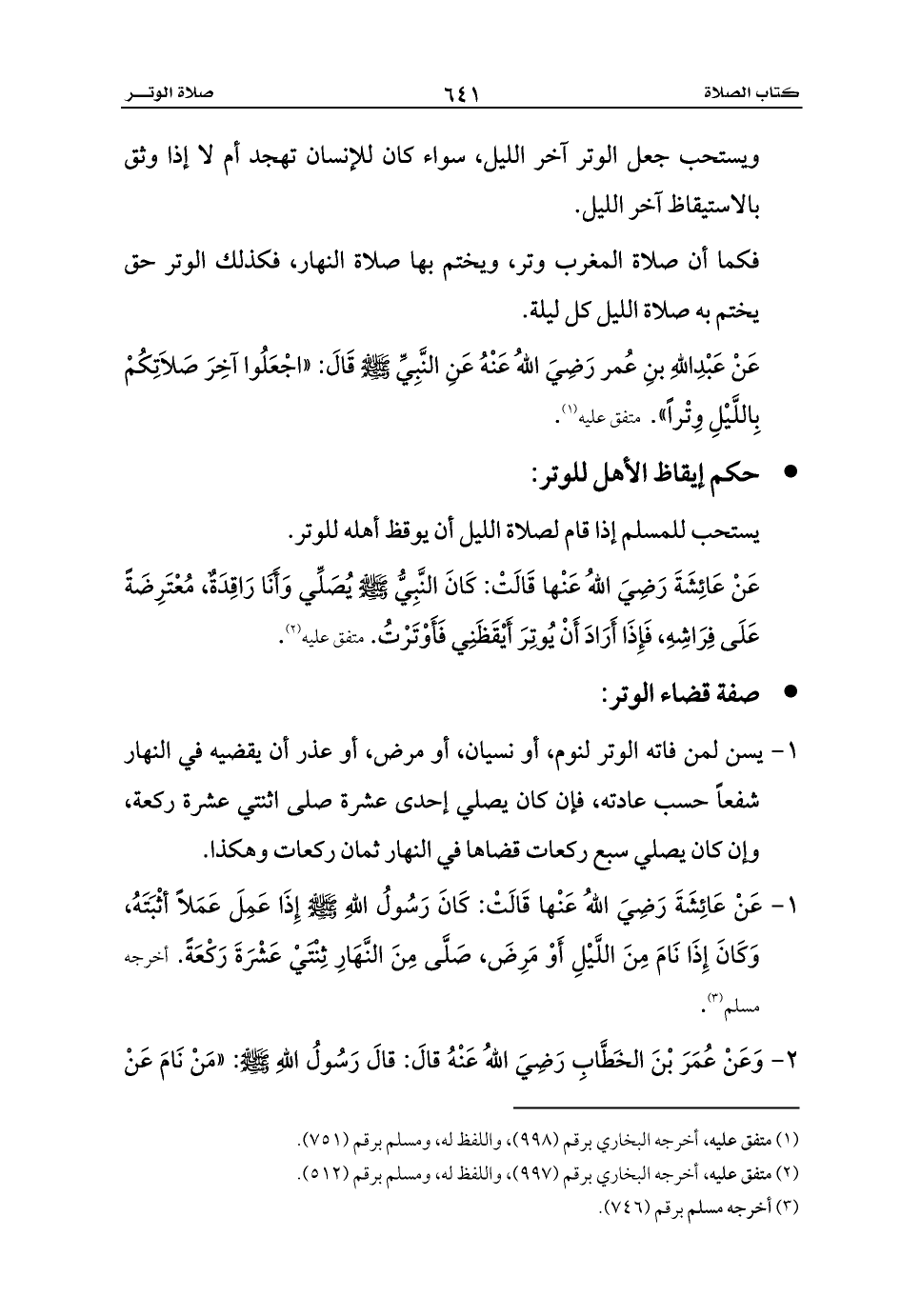 عَنْ عَبْدِاللهِ بنِ عُمر رَضِيَ اللهُ عَنْهُ عَنِ النَّبِيِّ - صلى الله عليه وسلم - قَالَ: «اجْعَلُوا آخِرَ صَلاَتِكُمْ بِاللَّيْلِ وِتْراً». متفق عليه (¬1).