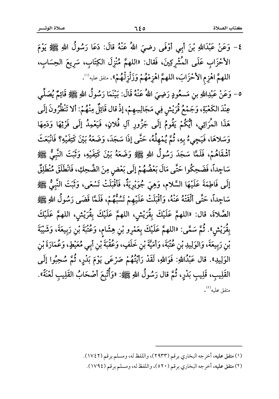 5 - وَعَنْ عَبْدِاللهِ بنِ مَسعُودٍ رَضِيَ اللهُ عَنْهُ قَالَ: بَيْنَمَا رَسُولُ اللهِ - صلى الله عليه وسلم - قَائِمٌ يُصَلِّي عِنْدَ الكَعْبَةِ، وَجَمْعُ قُرَيْشٍ فِي مَجَالِسِهِمْ، إذْ قال قَائِلٌ مِنْهُمْ: ألا تَنْظُرُونَ إلَى هَذَا المُرَائِي، أيُّكُمْ يَقُومُ إلَى جَزُورِ آلِ فُلانٍ، فَيَعْمِدُ إلَى فَرْثِهَا وَدَمِهَا وَسَلاهَا، فَيَجِيءُ بِهِ، ثُمَّ يُمْهِلُهُ، حَتَّى إذَا سَجَدَ، وَضَعَهُ بَيْنَ كَتِفَيْهِ؟ فَانْبَعَثَ أشْقَاهُمْ، فَلَمَّا سَجَدَ رَسُولُ اللهِ - صلى الله عليه وسلم - وَضَعَهُ بَيْنَ كَتِفَيْهِ، وَثَبَتَ النَّبِيُّ - صلى الله عليه وسلم - سَاجِداً، فَضَحِكُوا حَتَّى مَالَ بَعْضُهُمْ إلَى بَعْضٍ مِنَ الضَّحِكِ، فَانْطَلَقَ مُنْطَلِقٌ إلَى فَاطِمَةَ عَلَيْهَا السَّلام، وَهِيَ جُوَيْرِيَةٌ، فَأقْبَلَتْ تَسْعَى، وَثَبَتَ النَّبِيُّ - صلى الله عليه وسلم - سَاجِداً، حَتَّى ألْقَتْهُ عَنْهُ، وَأقْبَلَتْ عَلَيْهِمْ تَسُبُّهُمْ، فَلَمَّا قَضَى رَسُولُ اللهِ - صلى الله عليه وسلم - الصَّلاةَ، قال: «اللهمَّ عَلَيْكَ بِقُرَيْشٍ، اللهمَّ عَلَيْكَ بِقُرَيْشٍ، اللهمَّ عَلَيْكَ بِقُرَيْشٍ». ثُمَّ سَمَّى: «اللهمَّ عَلَيْكَ بِعَمْرِو بْنِ هِشَامٍ، وَعُتْبَةَ بْنِ رَبِيعَةَ، وَشَيْبَةَ بْنِ رَبِيعَةَ، وَالوَلِيدِ بْنِ عُتْبَةَ، وَأمَيَّةَ بْنِ خَلَفٍ، وَعُقْبَةَ بْنِ أبِي مُعَيْطٍ، وَعُمَارَةَ بْنِ الوَلِيدِ». قال عَبْدُاللهِ: فَوَاللهِ، لَقَدْ رَأيْتُهُمْ صَرْعَى يَوْمَ بَدْرٍ، ثُمَّ سُحِبُوا إلَى القَلِيبِ، قَلِيبِ بَدْرٍ، ثُمَّ قال رَسُولُ اللهِ - صلى الله عليه وسلم -: «وَأُتْبِعَ أصْحَابُ القَلِيبِ لَعْنَةً». متفق عليه (¬2).