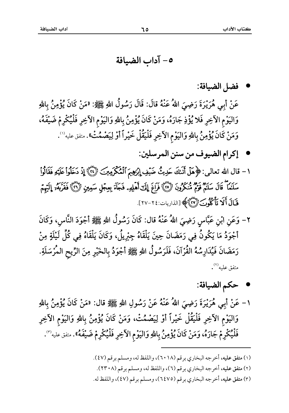 فَلْيُكْرِمْ جَارَهُ، وَمَنْ كَانَ يُؤْمِنُ بِاللهِ وَاليَوْمِ الآخِرِ فَلْيُكْرِمْ ضَيْفَهُ». متفق عليه (¬3).